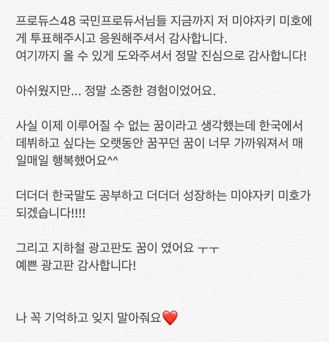 いっっぱい泣いた!!! 明日からは笑顔で😊😊😊 모두모두 ... 2018年09月01日 カテゴリ:宮崎美穂 いっっぱい泣いた!!! 明日からは笑顔で😊😊😊 모두모두 감사하고 사랑합니다!!! #프로듀스48 #produce48 ❤️❤️❤️ https://t.co/ASdrwdhIyN